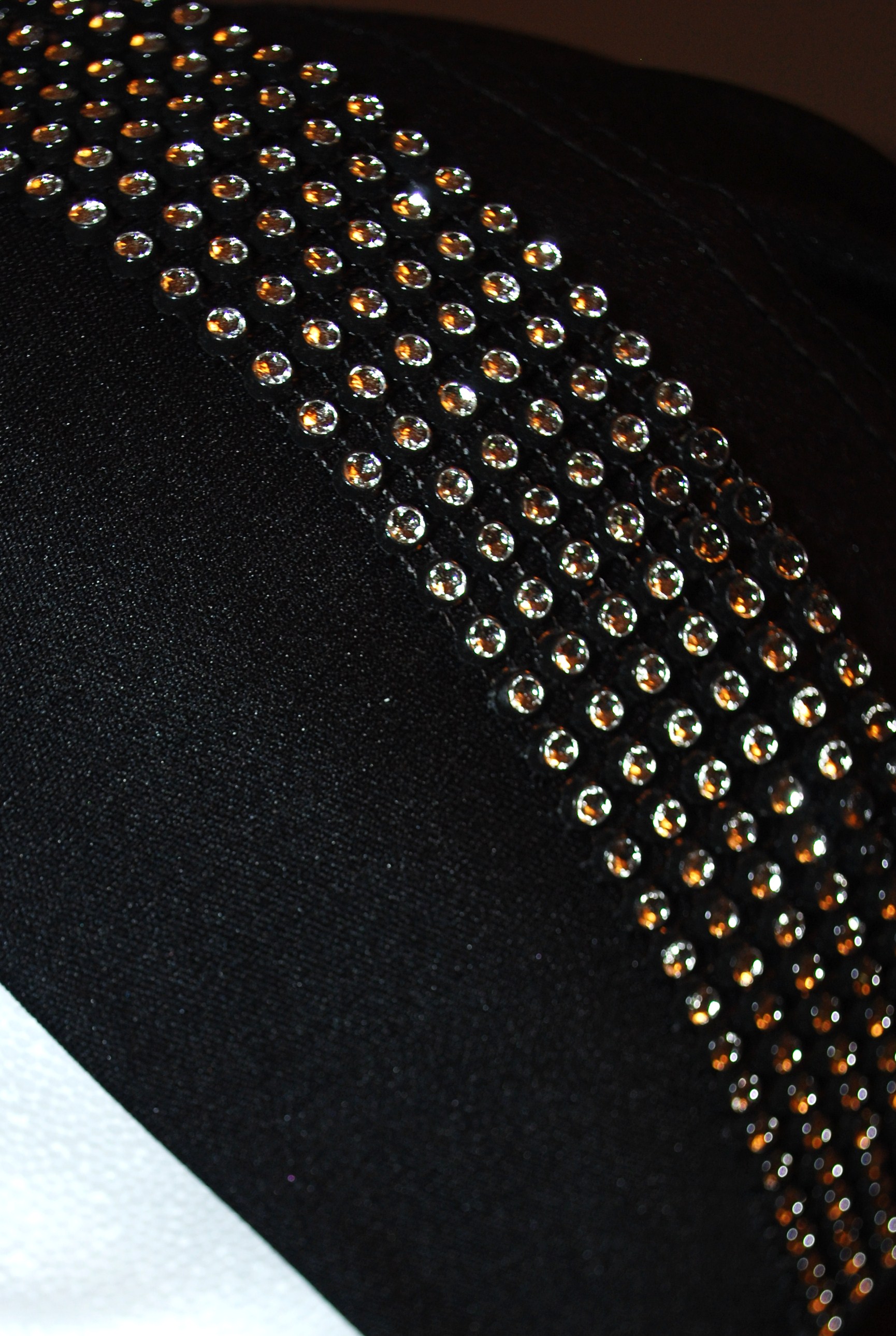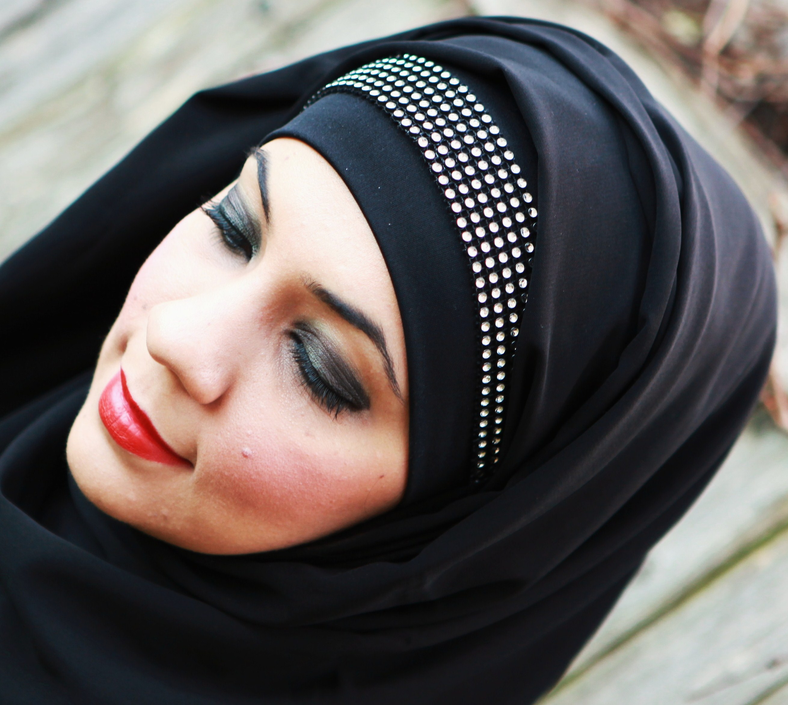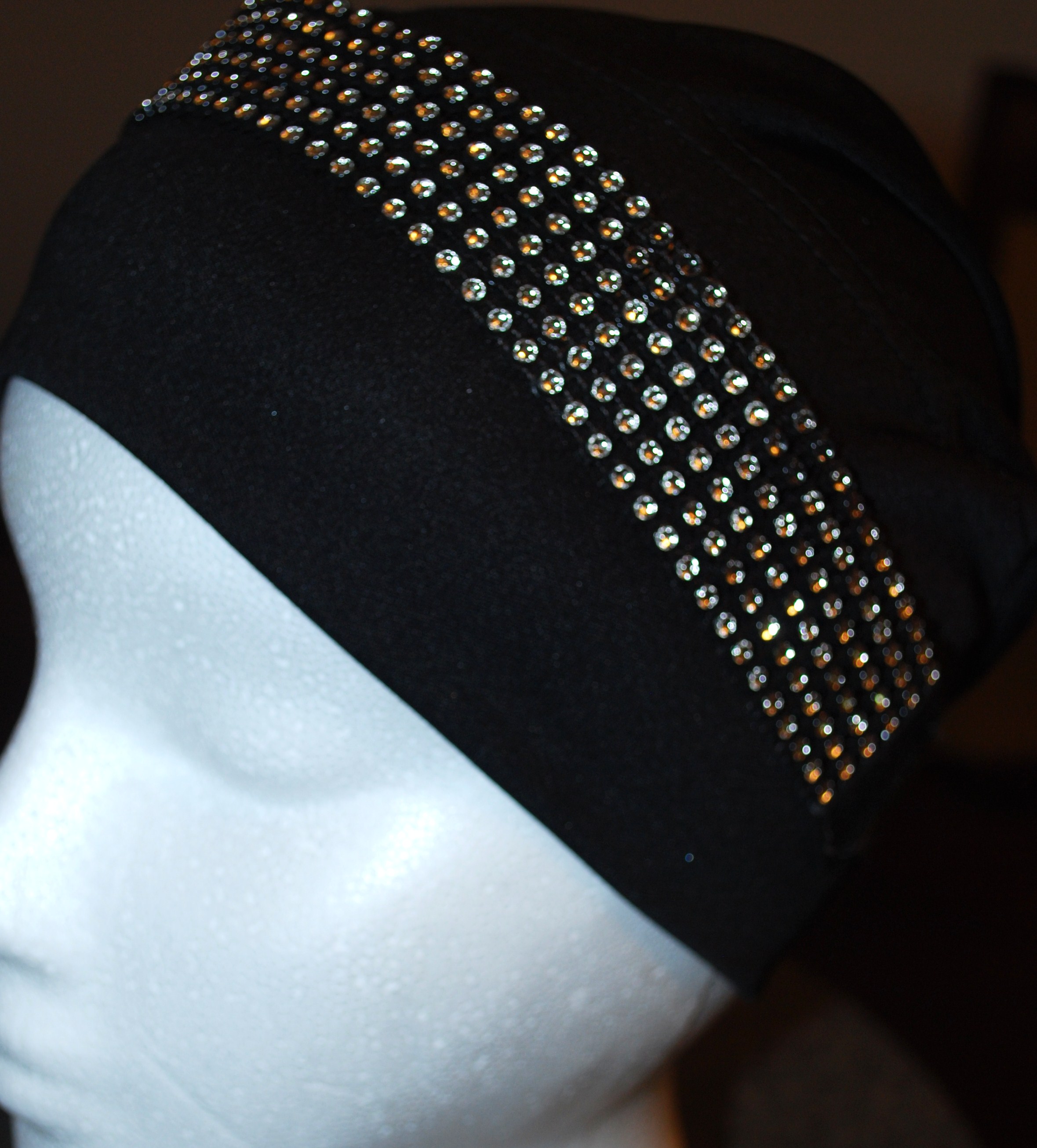 This stretchy accent head band has a small circular diamonds design on it. Perfect for a glamorous look. It has white stones on black stretchy band & can be worn on top of a hijab cap, hijab or even on your forhead to create several different looks!