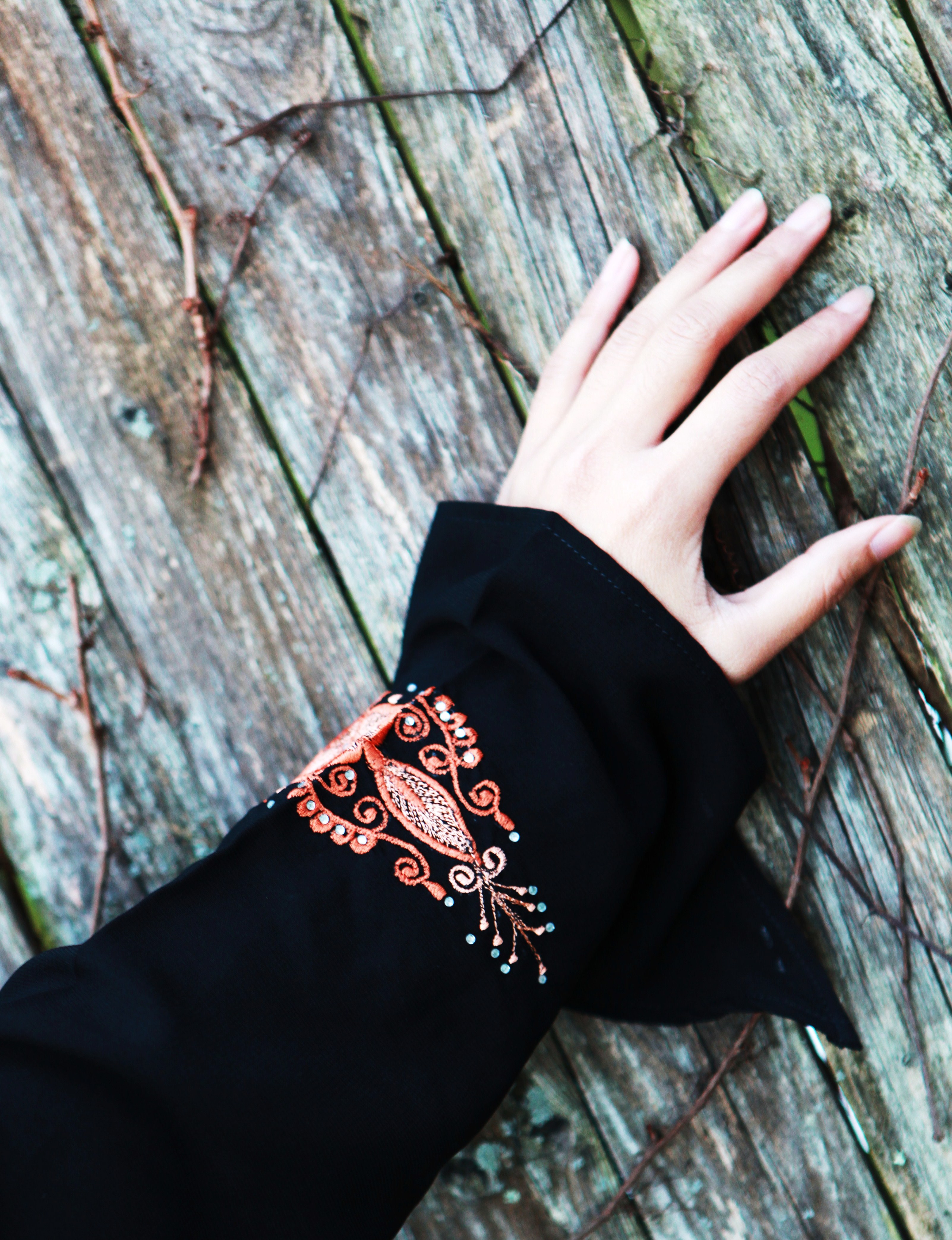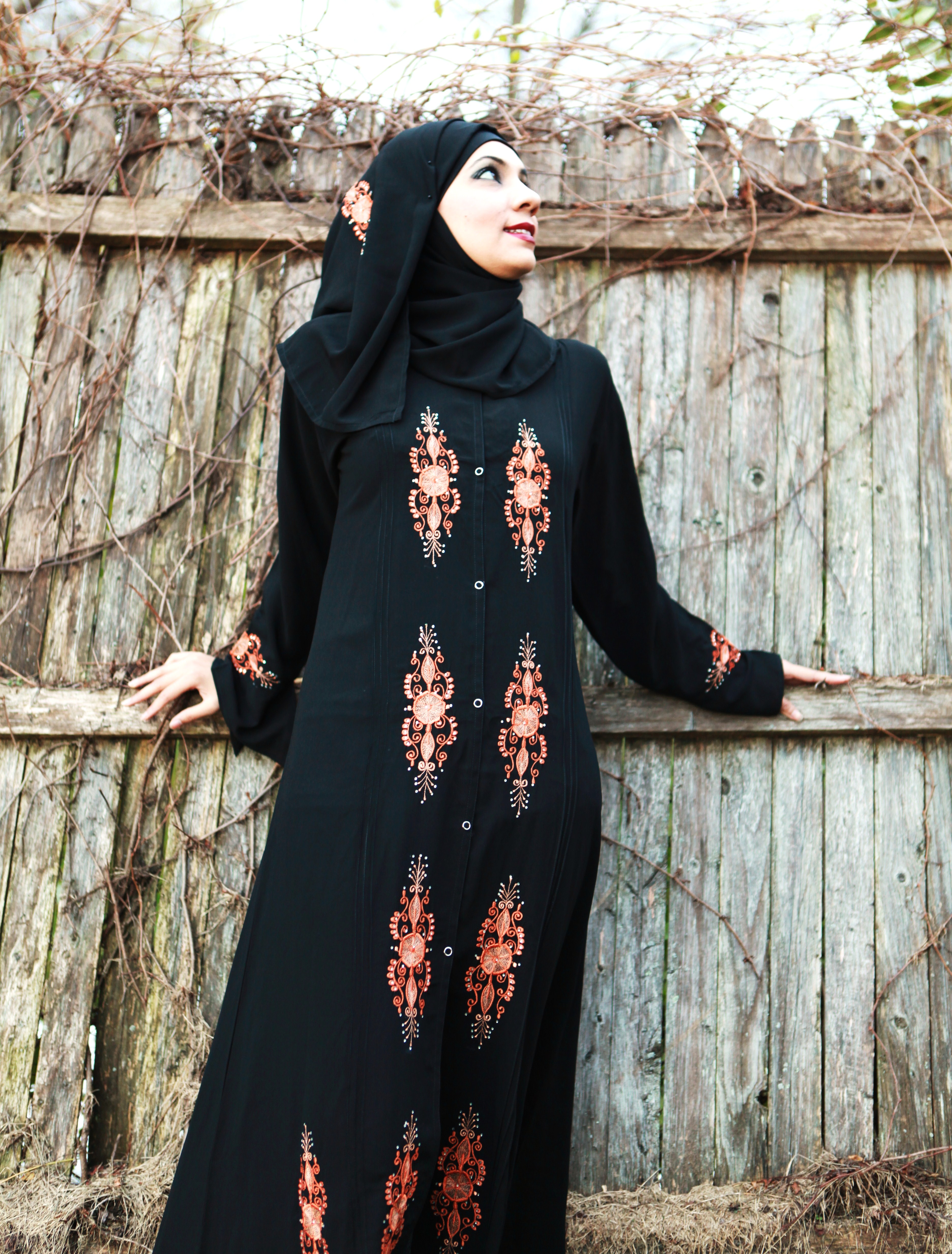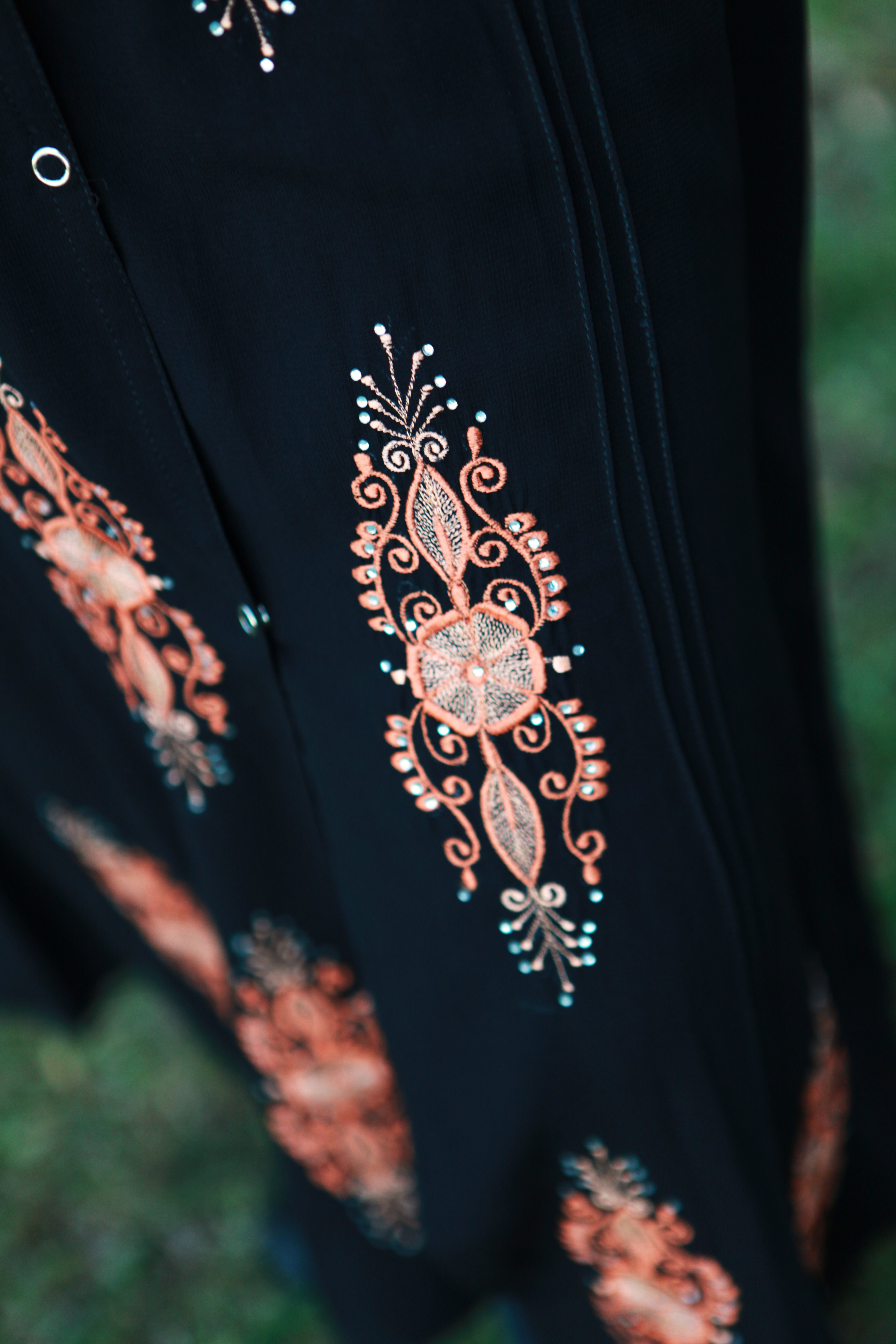 The Sarjan abaya is beautifully embellished with white rhinestones and is intricately embroided with deep orange silk threads. The embroided design is on the hijab, on the sleeves and also down the front of the abaya.