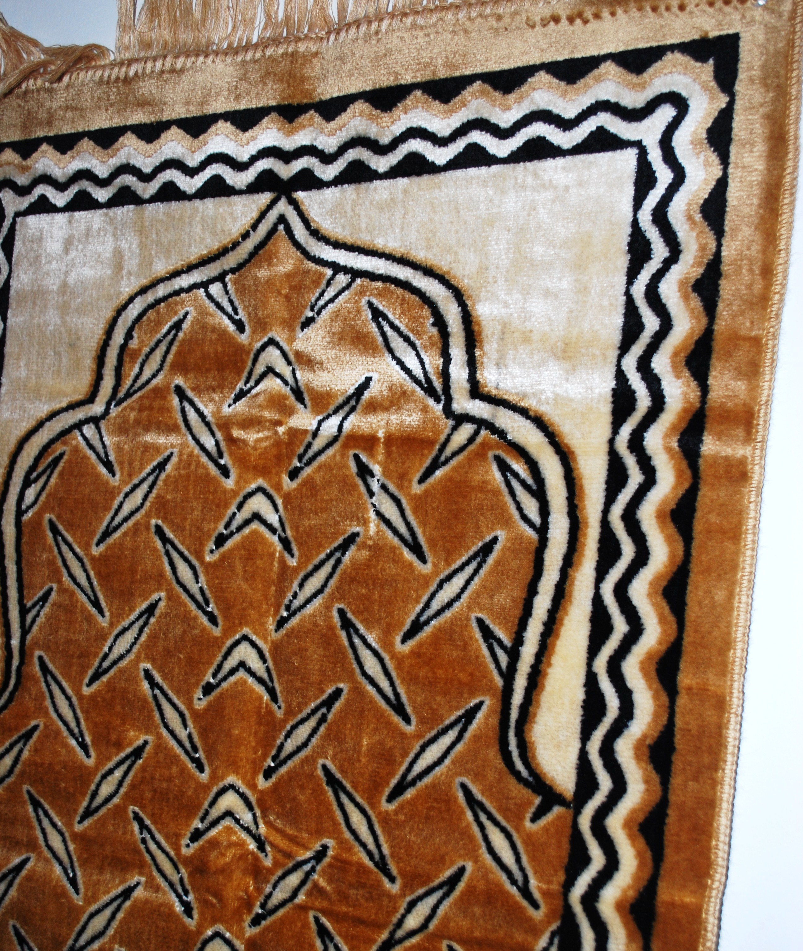The Oman janamaz is a full size prayer rug with a beautiful woven pattern on it. The colors are rich and the material is soft.