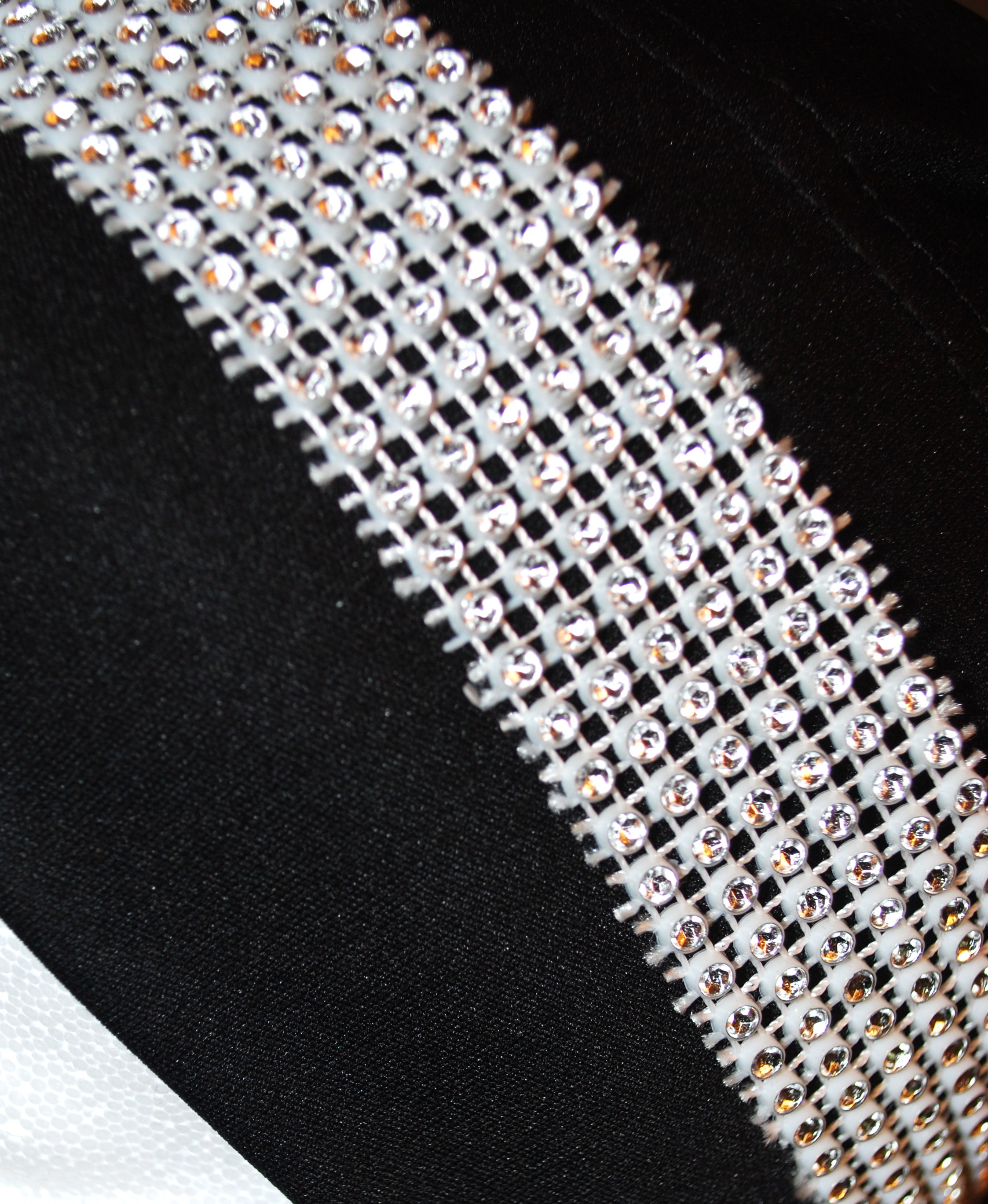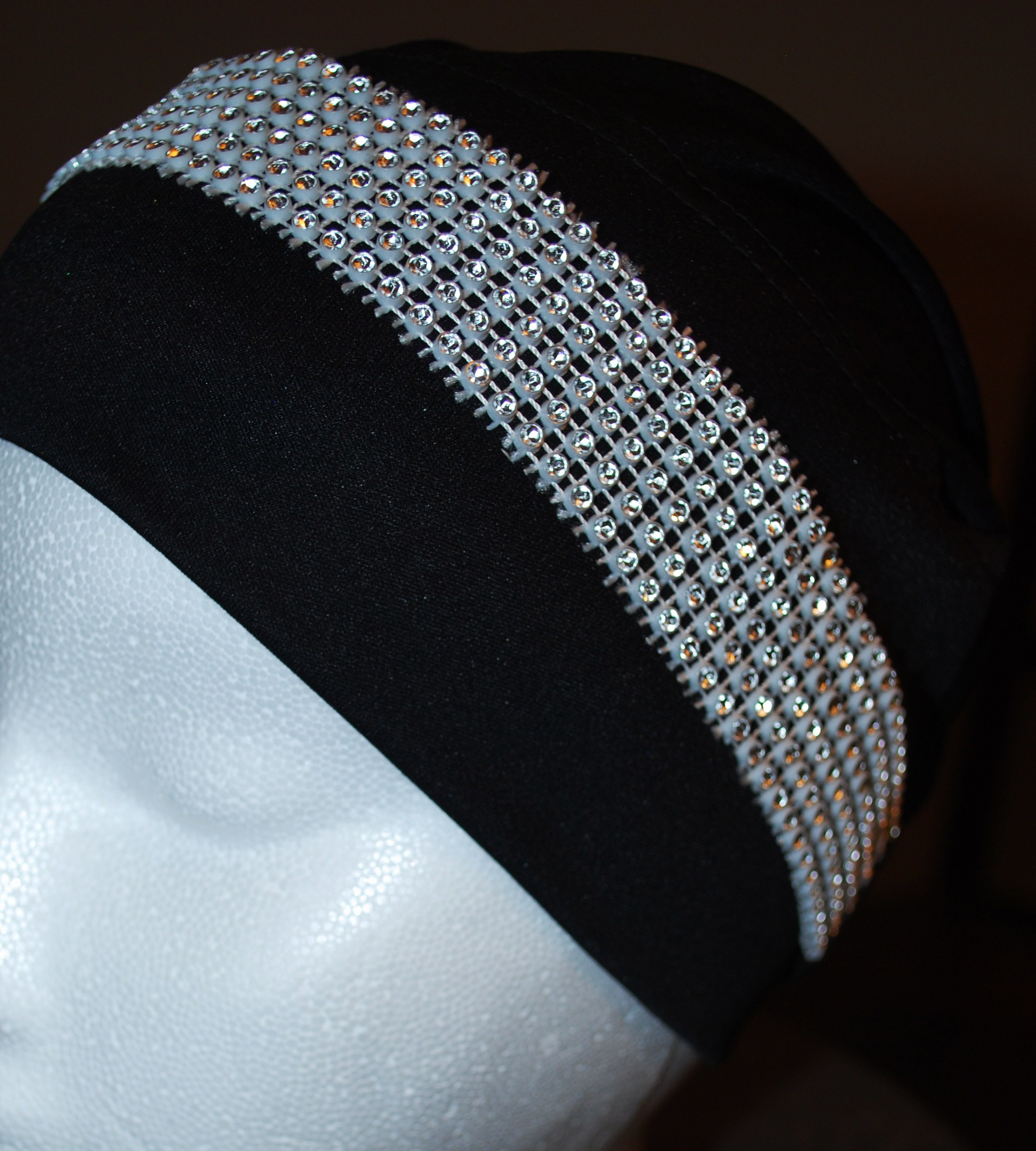 This stretchy accent head band has a small circular diamonds design on it. Perfect for a glamorous look. It has white stones on white stretchy band & can be worn on top of a hijab cap, hijab or even on your forhead to create several different looks!