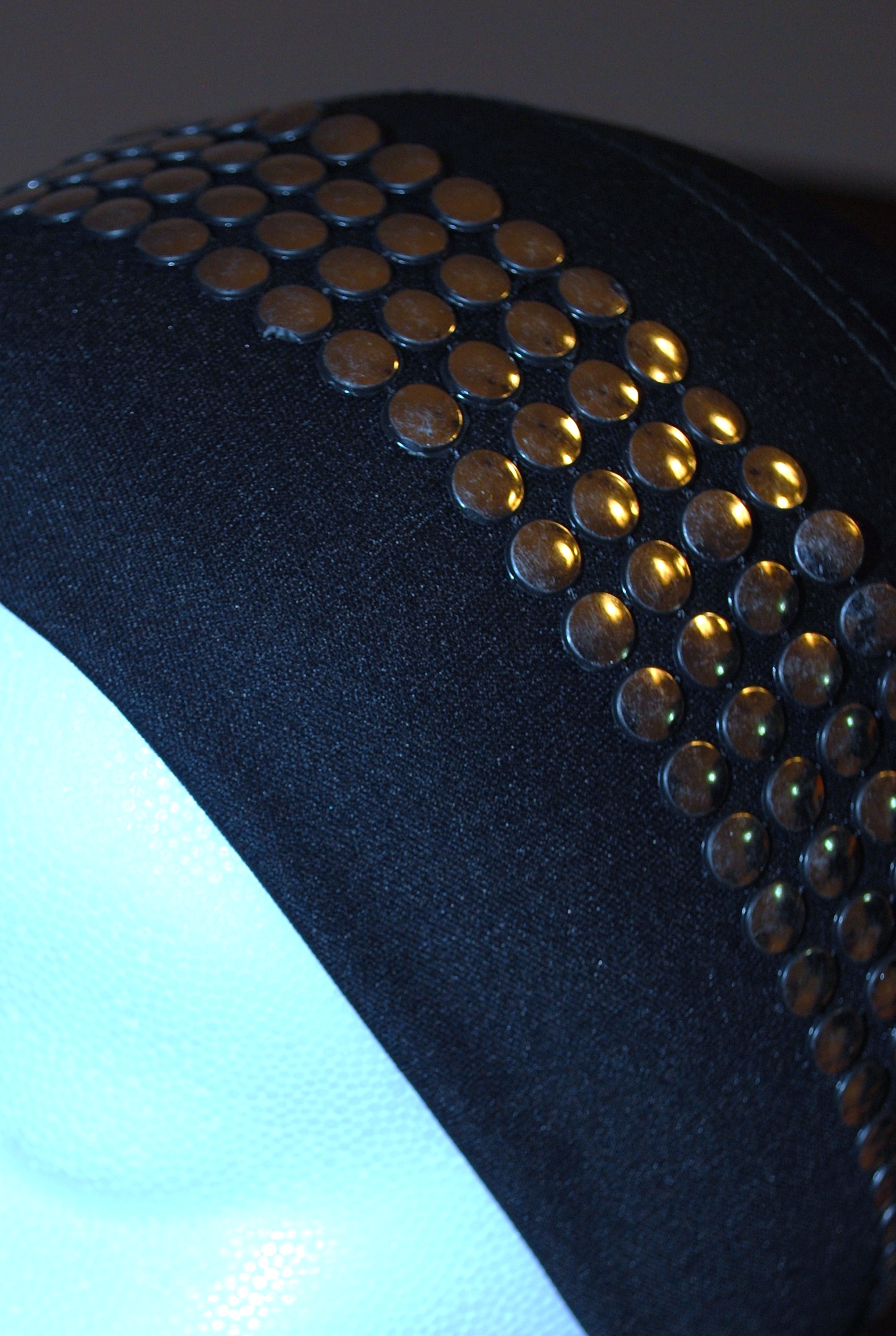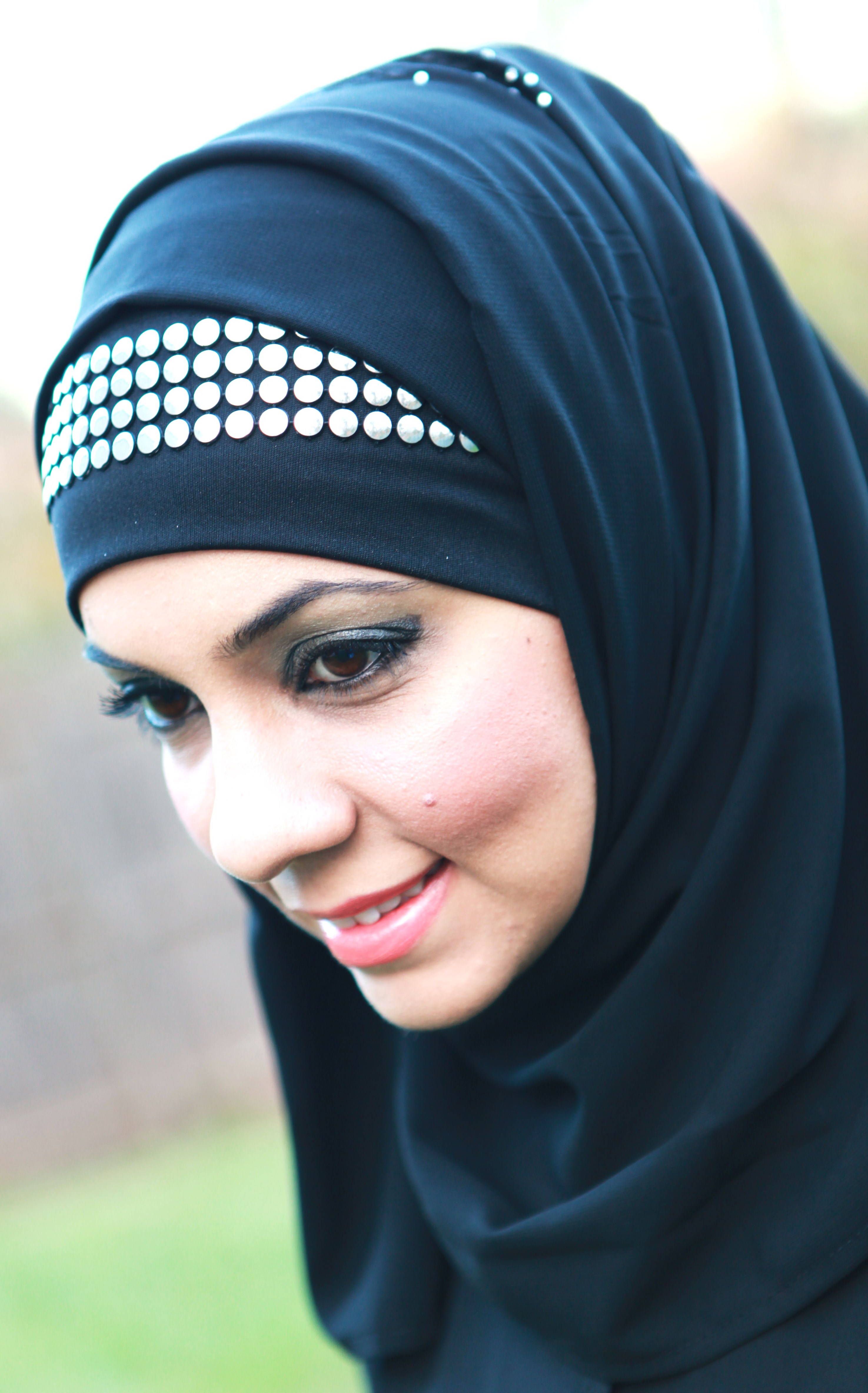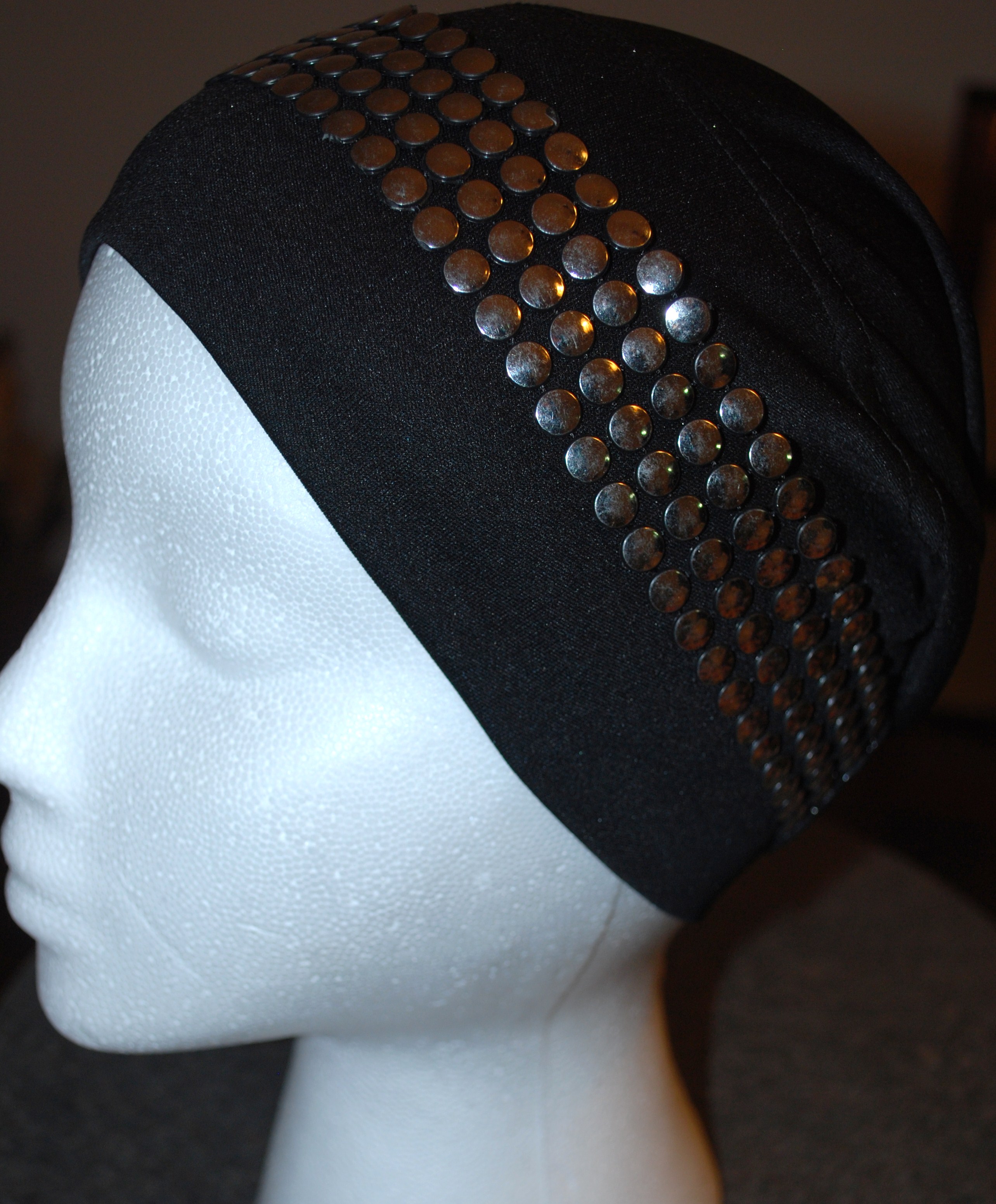 This stretchy accent head band has a metallic pushpin design on it. Perfect for a glamorous look. It has a silver pushpin design on black stretchy band & can be worn on top of a hijab cap, hijab or even on your forhead to create several different looks!