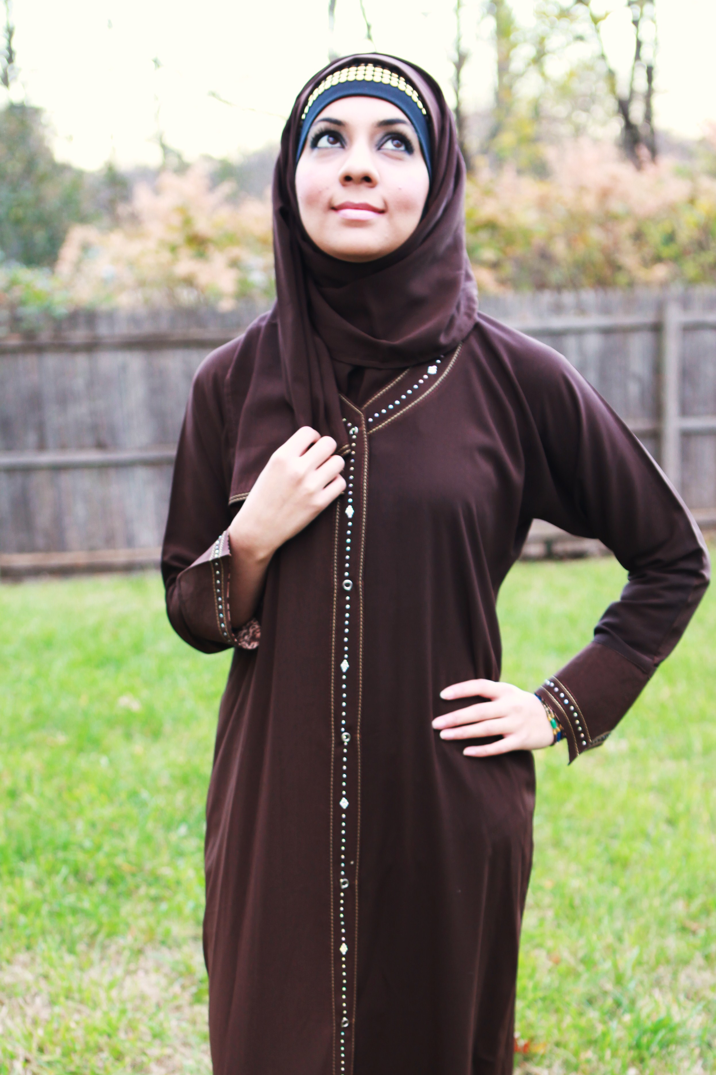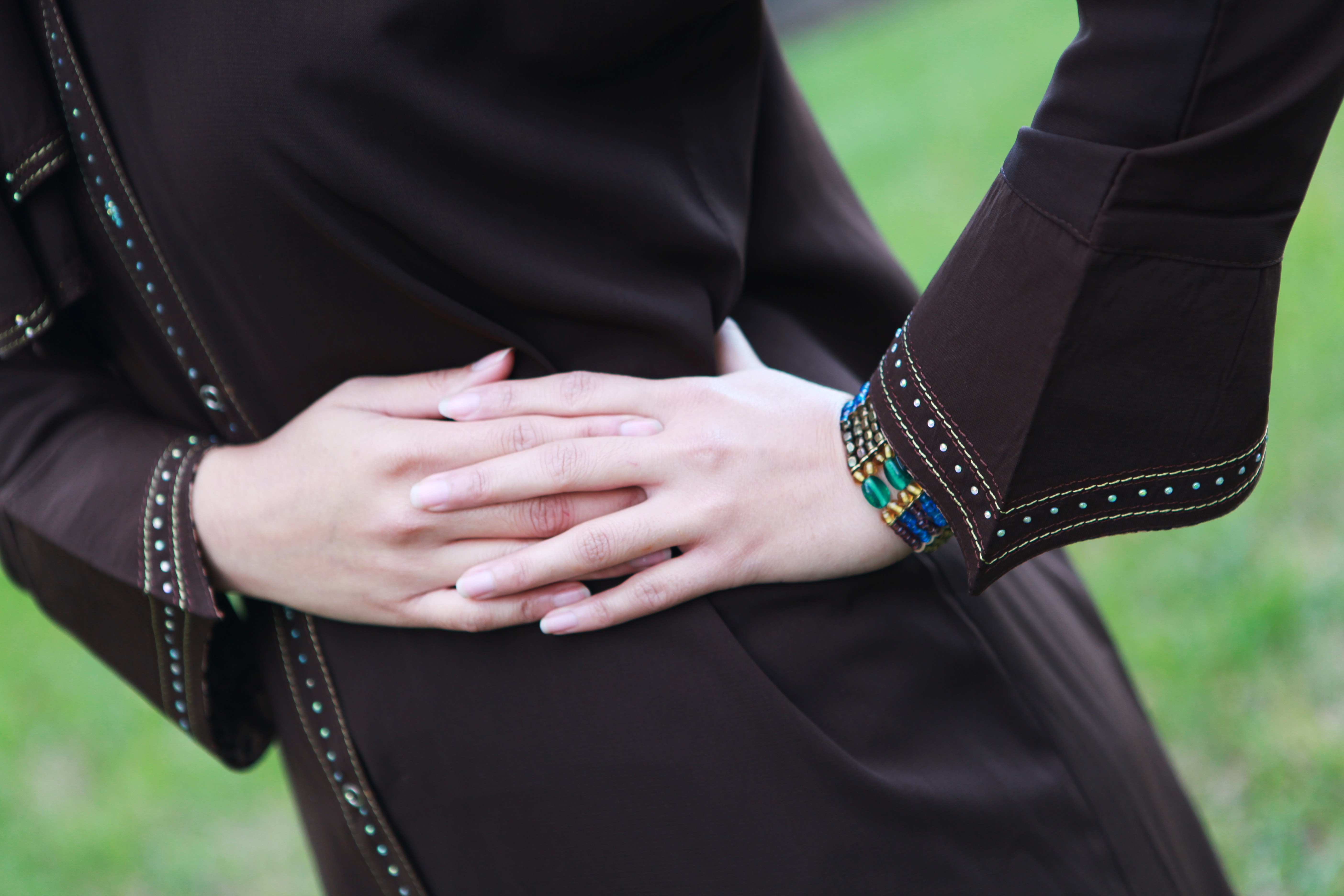 The Qazvin abaya is beautifully embellished with white rhinestones design pattern. The embroidery is on the neck collar, down the front of the abaya and also on the sleeves. The sleeves have an animal print inside the cuffs, so it can worn either all brown or can be folded to highlight the animal pattern.